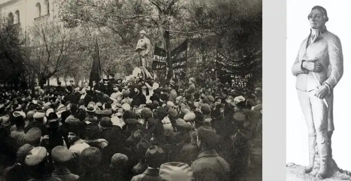 Вскоре после принятия декрета «О памятниках», летом 1918 года, на заседании СНК под председательством Ленина обсудили вопрос «О постановке в Москве 66 памятников великим людям в области революционной и общественной деятельности, в области философии, литературы, науки и искусства». Среди великих людей были деятели французских революций, идеологи революционной борьбы, видные анархисты, народовольцы, террористы-эсеры, французские просветители, декабристы, крупнейшие русские писатели и поэты, а также художники. Первым из них был открыт памятник «дворянскому революционеру» А.Н. Радищеву в Петрограде. Это произошло 22 сентября 1918 г. у ограды Зимнего дворца. Практически одновременно такой же бюст установили и на Триумфальной площади в Москве неподалёку от того места, где сейчас стоит памятник Маяковскому.