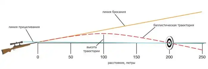 Если стрелять в мишень (например, в яблоко) с близкого расстояния, шагов с пяти, то нужно целиться стрелой прямо в яблоко. А вот если хочешь попасть в то же самое яблоко с большого расстояния, скажем, с двадцати шагов, то целиться нужно... выше яблока! Причём чем дальше мы будем относить мишень – тем выше надо задирать лук.