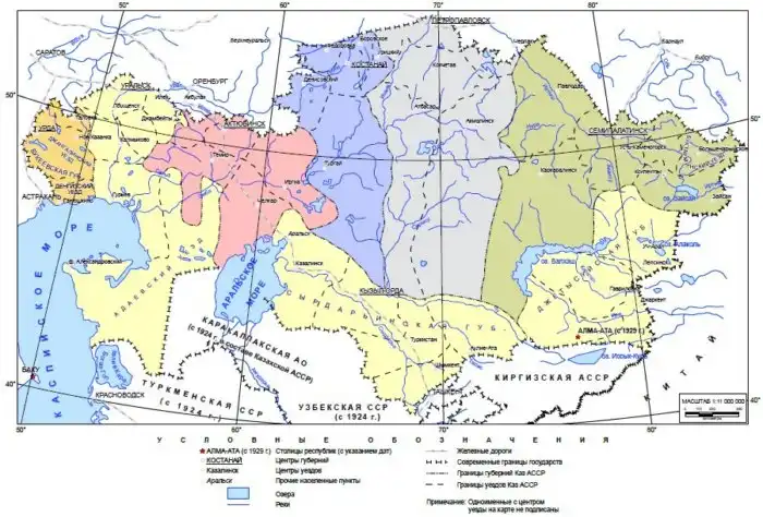 В 1936 году от юга РСФСР была отделена гигантская территория, которая включала в себя восточное побережье Каспийского моря, часть Алтая, Урала, Южной Сибири и Средней Азии. Она получила название – Казахская ССР.