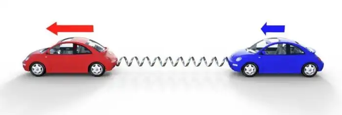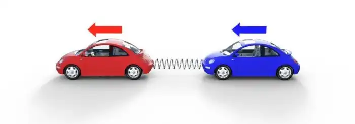 Ещё раз изменим условия опыта. Теперь пусть «прибавит газу» машинка впереди, а машинка сзади, напротив, «притормозит». Тогда – просто представьте себе эту ситуацию мысленно! – расстояние между машинками начнёт медленно увеличиваться, а пружинка при этом... Совершенно верно, растянется!