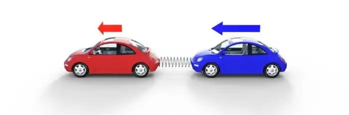 Теперь изменим условия опыта. Пускай у той машинки, которая «позади», сила тяги (то есть скорость) будет чуть-чуть выше. Тогда она начнёт медленно «догонять» машинку, расположенную впереди, а пружинка при этом начнёт... Правильно, сжиматься!