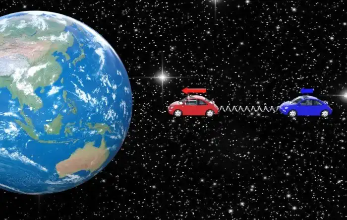 Звучит немножко запутанно? Ничего, разберёмся. Посмотрите на рисунок: красная машинка находится ближе к Земле, чем синяя: