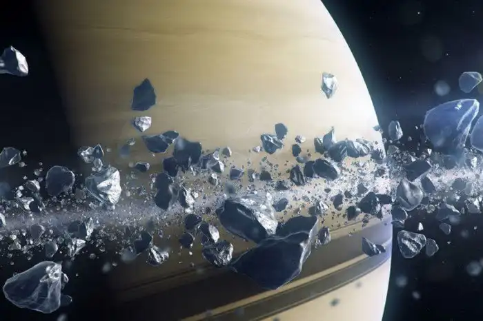 Тогда учёные выдвинули вторую гипотезу: когда-то у Сатурна был ещё один крупный ледяной спутник – а возможно, даже не один. Приливные силы от гигантской планеты медленно тормозили его на орбите, растягивали, «сминали», и в конце концов он развалился на миллиарды мелких частиц – так образовались кольца. Более тяжёлые тёмные частицы, состоящие из каменистых пород, постепенно осели в атмосферу планеты, а в составе кольца остались только лёгкие, состоящие из водяного льда. Именно поэтому кольца Сатурна такие яркие.