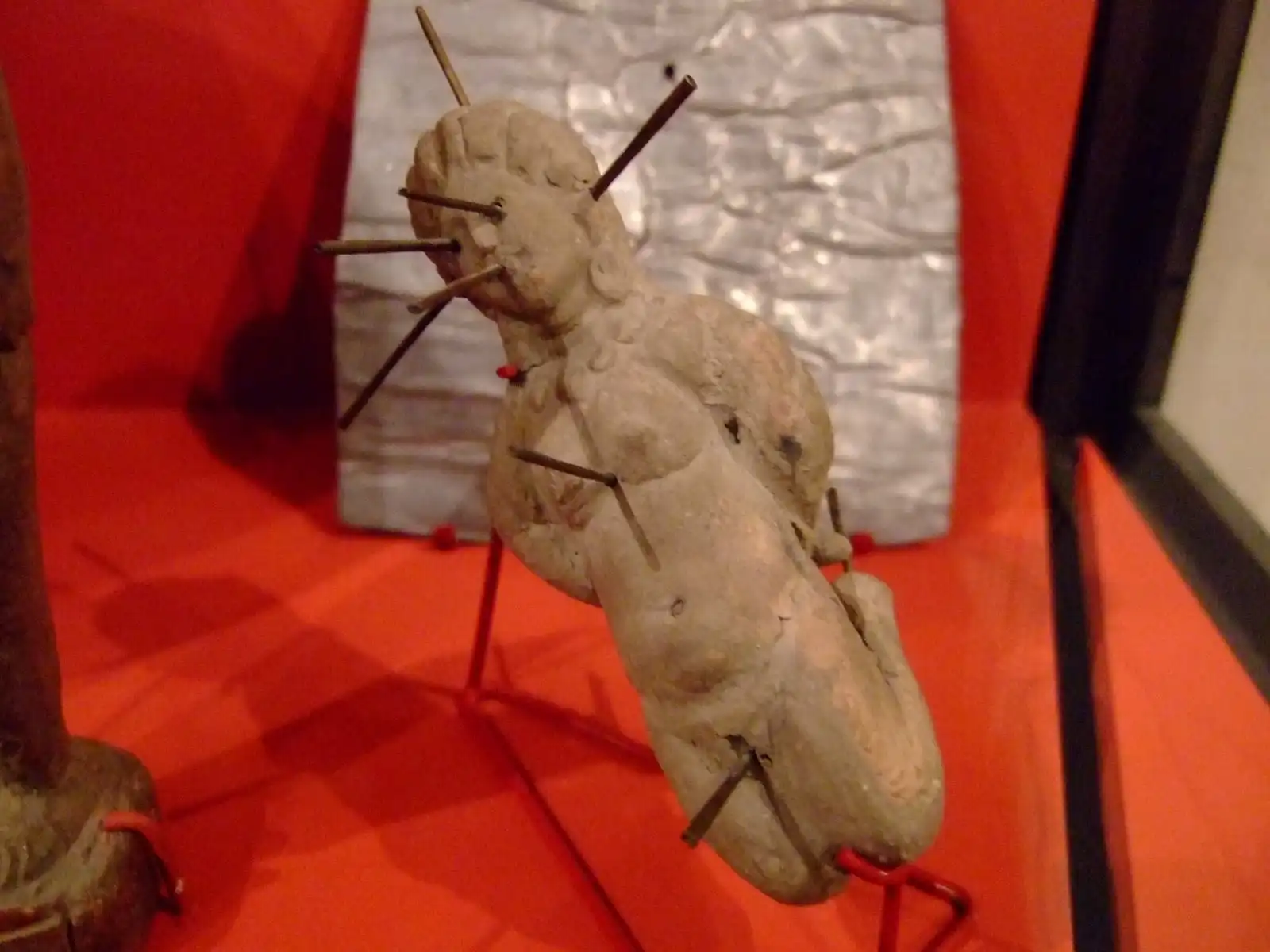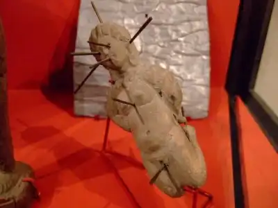 Кукла вуду связанной обнаженной женщины на коленях, пронзенная тринадцатью булавками. Находится в терракотовой вазе со свинцовой табличкой, на которой нанесено связывающее заклинание ( катадесмос ) .Источник изображения: Коллекция Лувра