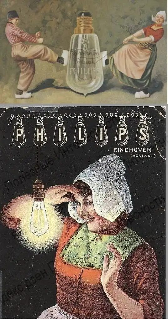 Из-за высокой конкуренции со стороны немецких производителей, дела у Philips шли на грани банкротства. Переломить ситуацию помогло переход на производство лампочек с вольфрамовой нитью. Очень веселый рекламный плакат по этому поводу