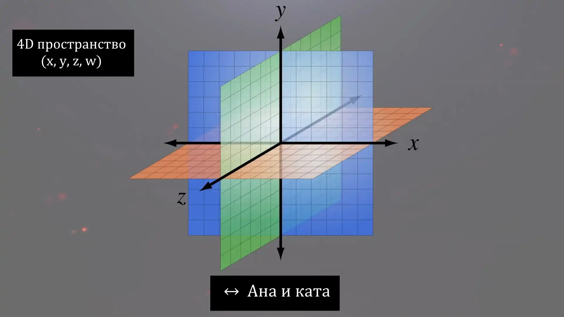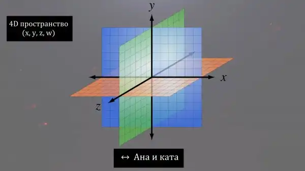 В таком мире можно провести еще одну ось перпендикулярную к остальным трем осям под углом 90 градусов. В трехмерном пространстве сделать это невозможно и как-то точно визуализировать я это не могу, так что включайте фантазию. В пятимерном мире так же добавятся новые направления движения, которые называют «ана-ката», получается: «влево-вправо», «вперед-назад», «вверх-вниз» и «ана»-«ката». Представить себе направление движения ана и ката мы не можем, так же как существо в двумерном мире не может представить себе направления вверх и вниз.