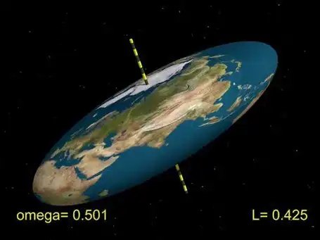 Короче будет происходить полная жесть, что-то будет плавится, что-то превратится в газ, что-то затвердеет, некоторые вещества станут радиоактивными, привычные нам вещи потеряют свои свойства и перестанут работать так, как в нашем мире. Я напомню, что это все в мире, в котором 4 пространственных измерения и одно временное и в котором можно двигаться в направлении ана и ката. Но кроме дополнительного направления появятся также дополнительные степени свободы во вращении. В нашем мире ориентацию тела можно задать тремя углами, в быту это называется «наклон, подъём и поворот», в 5D мире надо представить себе еще 3 дополнительных степени свободы вращения перпендикулярные к 3 вышеупомянутым. Но по идее, на вращение Земли это не должно повлиять, момент импульса сохранится, ведь нужно, чтобы какая-то сила передала момент импульса Земле, чтобы она могла вращаться в какой-то непривычный для нас способ. Конечно Земля изменит свой привычный облик, из-за того, что свойства химических элементов изменятся, но из-за гравитации все должно также удерживаться вокруг центра масс, правда земля довольно быстро вращается, а так как гравитация в 5D мире у нас ослабевает с кубом расстояния, то земля сплюснется и формой будет напоминать что-то типа такого, как на картинке.