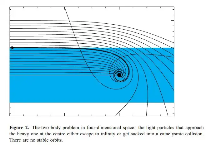 Будут ли происходить термоядерные реакции на солнце, тут под вопросом, но изменения явно произойдут. Но вот что забавно – в пятимерном мире нет стабильных орбит. Вот, посмотрите на график, это моделирование классической задачи двух тел, оказывается, что устойчивых орбит в 5D мире нет, тела либо падают друг на друга, либо улетают в бесконечность, поэтому солнечная система, как и все другие системы, разрушится, некоторые тела упадут на другие тела, а некоторые улетят бороздить просторы галактики.