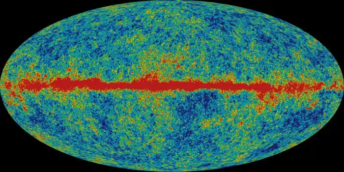 Карта реликтового излучения. Красные цвета - более горячие области, синие - холодные. Красная полоса посередине - это «засветка» от нашей галактики «Млечный путь»
