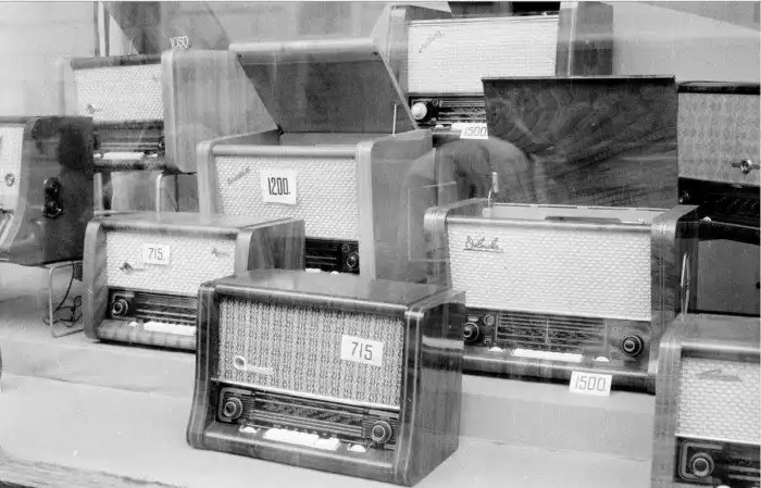 Хотя на полках выше и ниже еще есть аппараты, но он именно крупным планом сфотографировал этих двух красавцев. Радиоприемник высшего класса "Фестиваль" стоит 2400 рублей, а его первоклассный сосед "Беларусь-57" стоит 1350 рублей. На нижней полке чуть видно крышку радиолы "Дружба" и "Эстония"