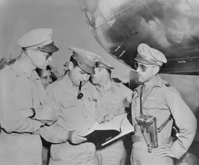 Американские генералы Кертис Лемей (в центре), командир 21-го бомбардировочного командования, бригадный генерал Лорис Норстад (слева), начальник штаба 20-й воздушной армии читают отчет о бомбардировке Токио 9-10 марта 1945 г. Справа стоит бригадный генерал Томас Пауэр, командовавший бомбардировкой. (Остров Гуам, 15 марта 1945 года)