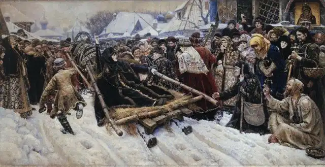 Монументальное полотно Сурикова изображает средневековый раскол русской церкви и сцену ареста старообрядки боярыни Морозовой, отказавшейся креститься тремя перстами, согласно новой церковной реформе. Картина произвела большое впечатление на публику как удачный эксперимент с сюжетом из русской истории.