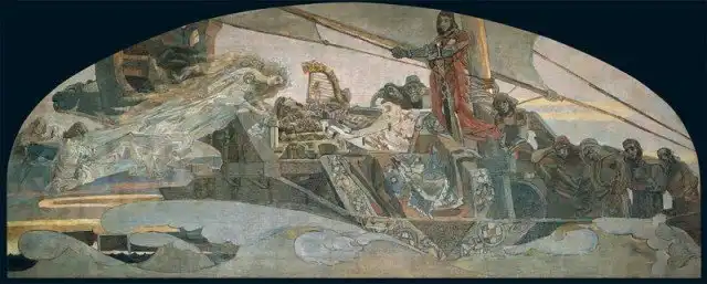 Жюри Академии, посмотрев на работу, велели ее убрать - состоялся настоящий скандал среди влиятельных людей, который дошел даже до императора Николая II. Тот велел сделать, как просит Академия (хотя в будущем он еще будет восхищаться Врубелем). В итоге был найден компромисс - и работу за Врубеля заканчивал известный художник Василий Поленов. Однако панно так и не было показано в павильоне. Зато Мамонтов привез множество других картин Врубеля на выставку, а также организовал показ театральной постановки, где он выступал художником по декорациям.