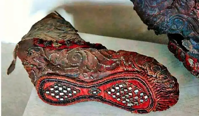 Эта туфелька сохранила свой цвет и форму спустя 2300 лет! Найдена на Алтае. Причем не в единственном экземпляре – к великой радости археологов, им удалось обнаружить целую коллекцию древней обуви в прекрасном состоянии.