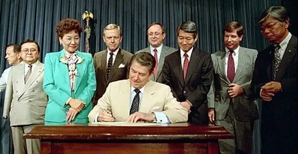 В 1988 году президент США Рейган подписал Закон о гражданских свободах, который предоставил компенсацию в размере 20 тыс долларов каждому американцу японского происхождения (и их детям), отправленному в лагеря для интернированных