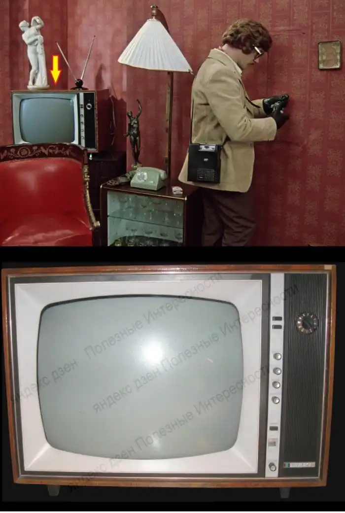 По иронии судьбы, за 6 лет до этого, этот телевизор олицетворял богатство большого чиновника СССР-товарища Саахова в фильме "Кавказская пленница"