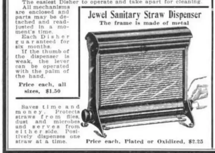 Но законы, регулирующие здравоохранение, пошли дальше. Один канзасский доктор выступил против использования «общей чашки». Запрет впервые появился в Канзасе, а затем распространился по всей стране. «Картина того, как группа здоровых мужчин стоит вокруг фонтана с водой и пьет через трубочки, ни у кого не вызывало ни удивления, ни насмешек» — сообщает Shelbina Democrat от 11 октября 1911. Чашки и соломинки должны были быть идеально чистыми, чтобы гарантировать отсутствие на них микробов. Для этого гражданам было разрешено выбирать собственные соломинки при условии, что никто другой не будет к ним прикасаться. Это привело к созданию диспенсера для соломинок. Его главным преимущество было то, что он «защищает от мух, пыли и микробов».