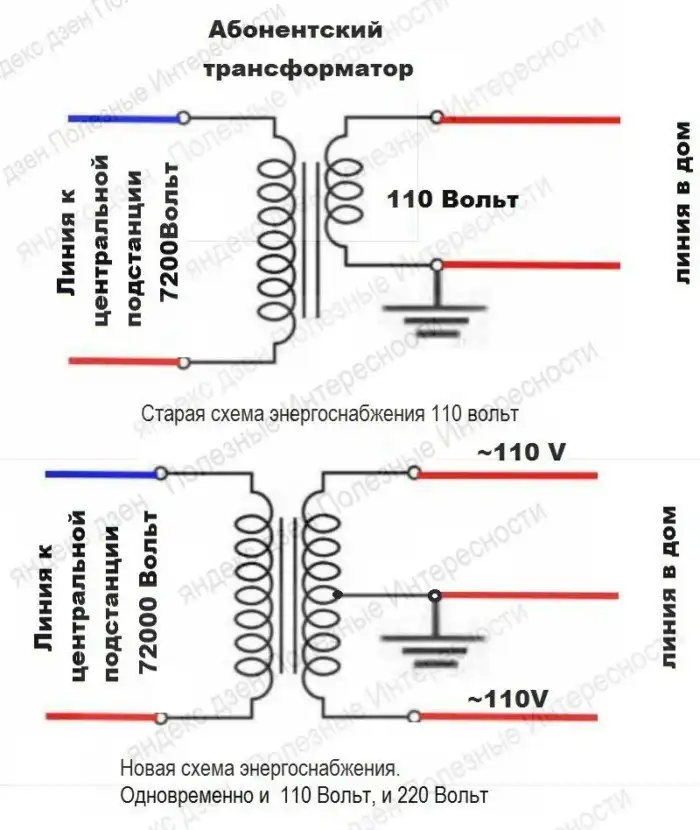 В итоге было найдено "соломоново" решение: сеть 110 Вольт оставить и постепенно в домохозяйства проводить вторую фазу на 110Вольт. Для маломощных так же используется 110 Вольт, а для мощных электроприборов суммарное напряжение двух фаз 110+110=220 Вольт.