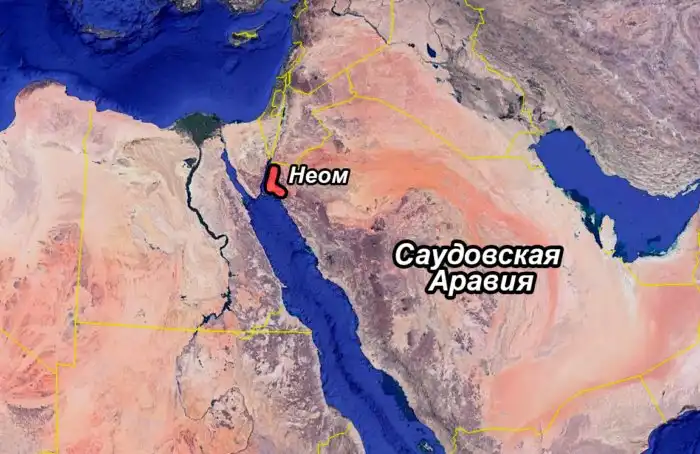 Неом воздвигается в северо-западной провинции Табук. Он растянется на 460 км вдоль побережья Красного моря и займёт 26 500 км² площади. Авторы проекта заявляют, что для 40% населения планеты добраться до города можно будет всего за 4 часа полёта в самолёте.