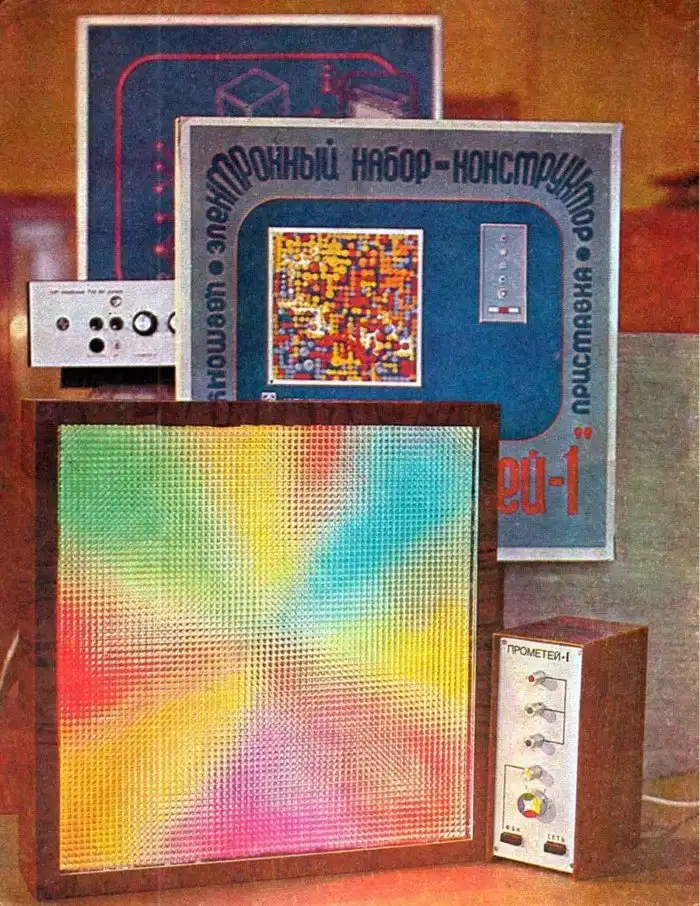 Эту цветомузыку с 1977 года начали выпускать на Ульяновском приборостроительном заводе в виде конструктора "Прометей-1". Тут уже экран был размером 40х40 см. и светорассеиватели были из стеклянных трубочек. Цена конструктора 60 рублей.