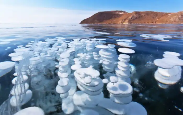 Каждую зиму льды Байкала заполняют необычные белые пузыри разного диаметра. Это метан, образующийся глубоко на дне озера и промерзающий зимой на поверхности. Если просверлить в пузыре небольшое отверстие и поднести к нему спичку, место вспыхнет подобно газовой конфорке.