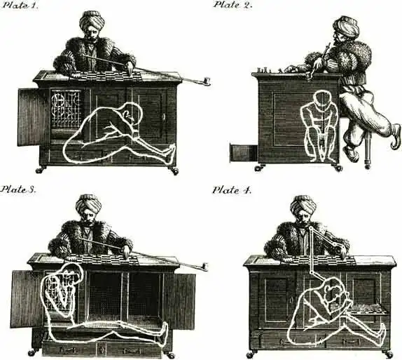 В 1769 австрийский строитель Вольфганг фон Кемпелен представил шахматный автомат, который обладал поразительными навыками игры в шахматы. Он легко обыгрывал всех. Автомат возили по всему миру. За шахматной доской с ним сражались Наполеон и Бенджамин Франклин и оба были повержены.