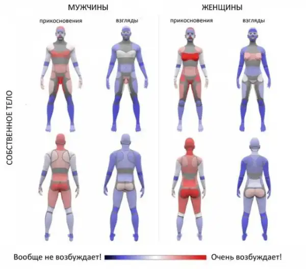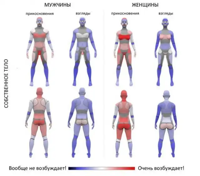Красным выделены участки тела, прикосновение к которым вызывает большее возбуждение у прикасающегося (смотрящего), чем у его партнера, синим — наоборот. Белые зоны одинаково возбуждают обоих.