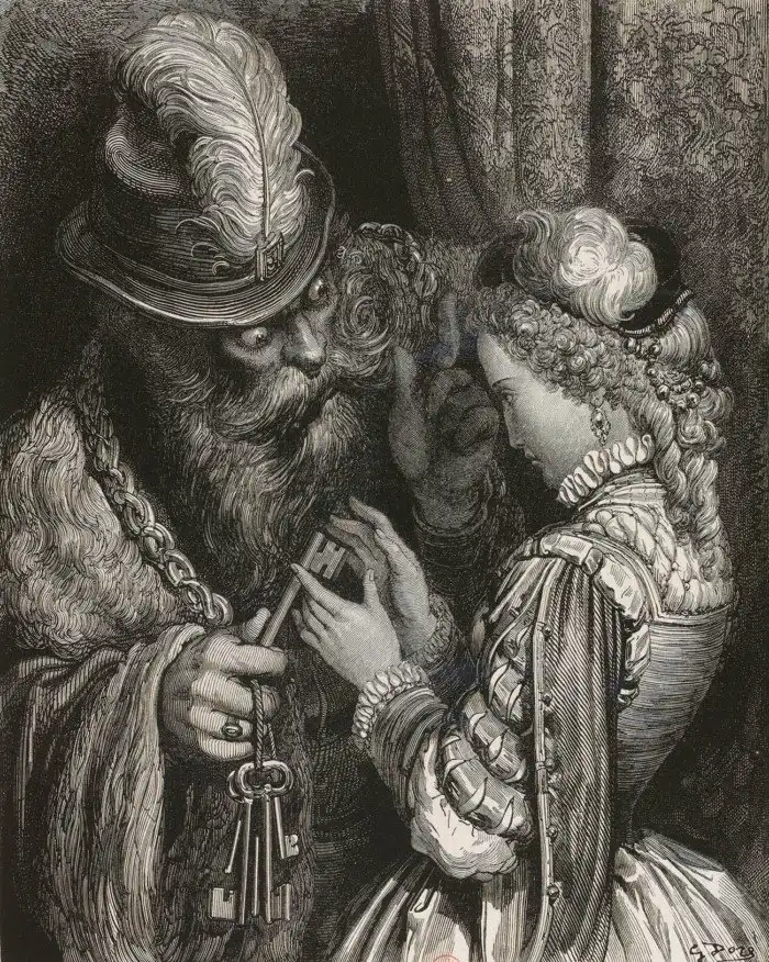 Синяя Борода, передавая жене ключи от всех дверей в замке, запрещает открывать только одну из них... Итог известен заранее. Иллюстрация Гюстава Дорэ к сказке Шарля Перро