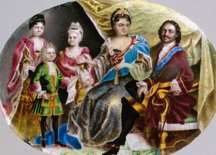 Пётр I с женой Екатериной, дочерьми Анной, Наталией и Елизаветой и внуком Петром (тем самым, от царевича Алексея), миниатюра 1720-х годов