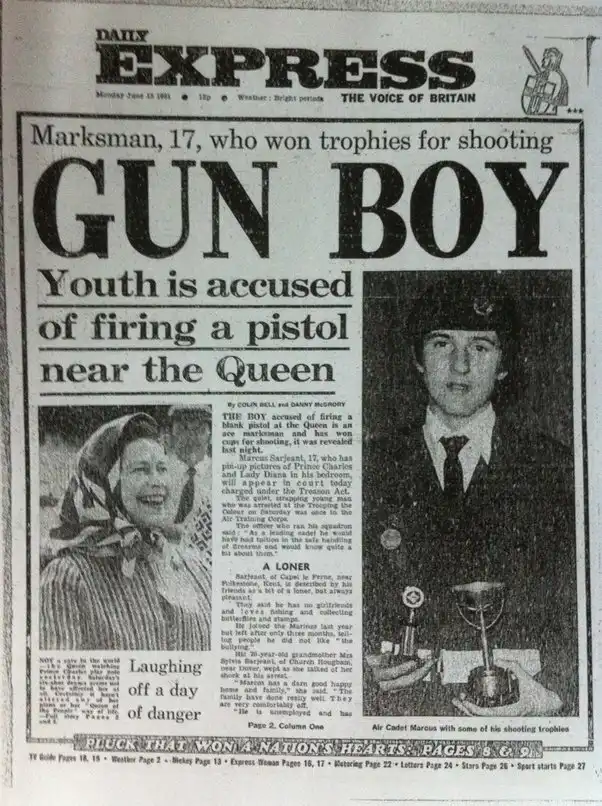 Это «покушение» произошло в том же году, что и предыдущее, только на пять месяцев раньше, 13 июня. Елизавета II на этот раз находилась на территории своей страны, но злоумышленником снова оказался пубертатный недоросль – 17-летний Маркус Сарджент.
