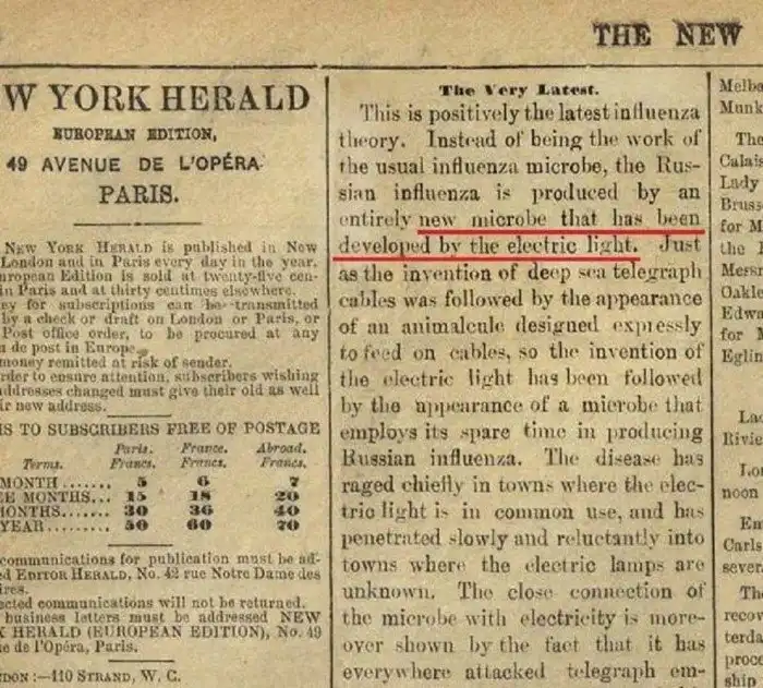 Помните, как в 2020-м вместе с вирусом по миру пошли и различные теории заговора о его возникновении, которое связывали с некоторыми технологическими новшествами? Видимо, такова участь всех крупных пандемий. «Русский грипп», прокатившийся по планете более ста лет назад не стал исключением. В конце января 1890 года в «Нью-Йорк Таймс» вышла публикации, где появление неизвестного ранее заболевания связали с электрическим светом.