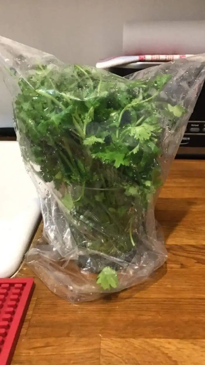 Чтобы зелень долгое время оставалась свежей, накройте её полиэтиленом, закрепите плотно резинкой и отправьте в холодильник. Таким способом можно хранить зелёный лук, базилик, петрушку, кинзу.