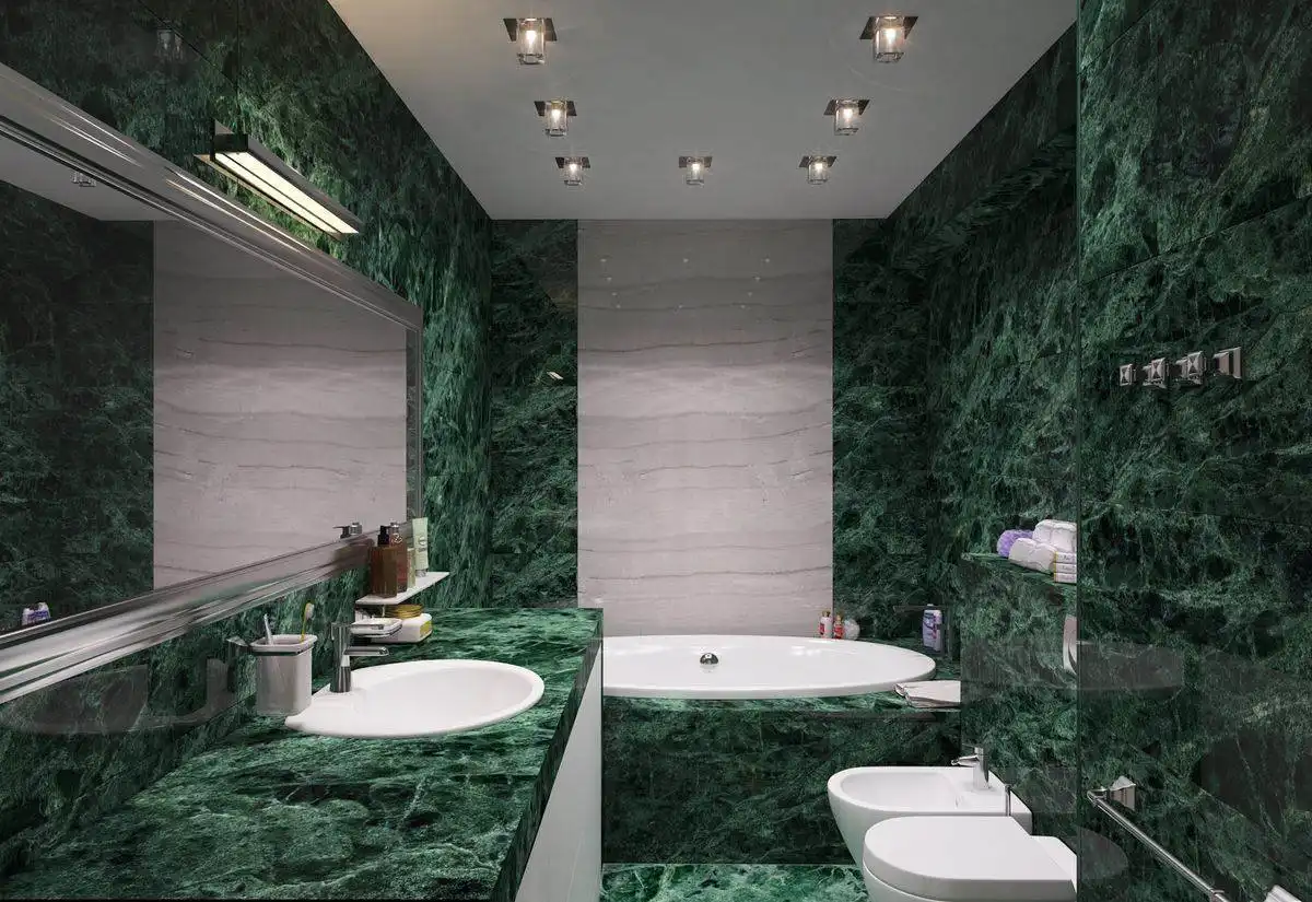 Внешний вид зеленого мрамора с разноцветными прожилками на калиброванных панелях из керамогранита не только напоминает о природе, но и заставляет нас чувствовать, что мы находимся в объятиях природы. Сочетание этого вида с более темным мрамором на полу и многочисленными растениями создает уютную атмосферу, напоминающую природу.
