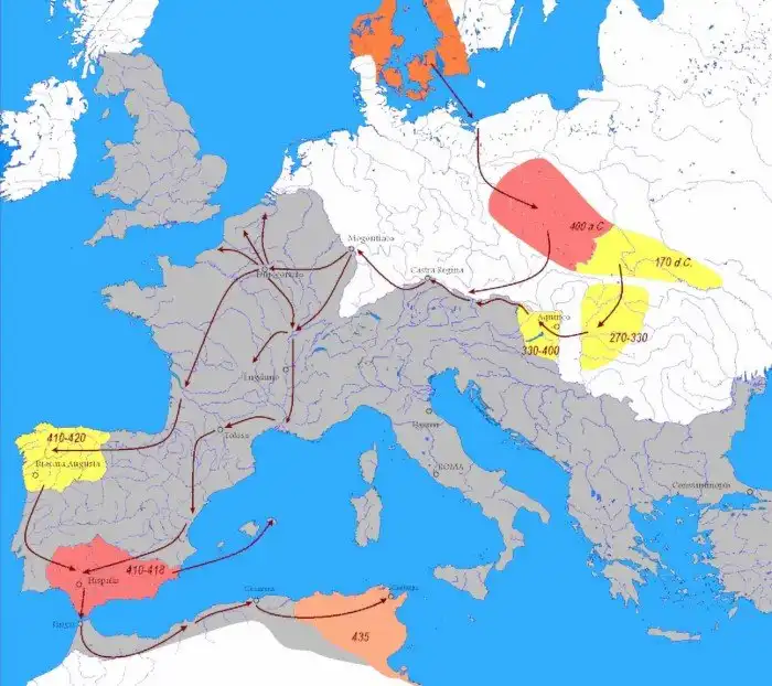 По мере ослабления сюзерена и удара с востока гуннов, вандальские племена ушли со своего места проживания вглубь империи. В 407-409-х они разорили Галлию, разбив по пути римские, франкские и местные германские племена. К 429 году вандалы уже хозяйничали в Испании.