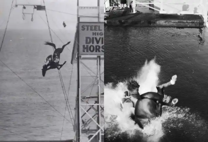 В 1881 году один американский стрелок ехал на лошади по мосту. Мост был старым и начал рушиться прямо под копытами коня. Конь упал в воду, а стрелку пришла гениальная и абсолютно идиотская идея нового аттракциона - конные прыжки в воду. Развлечение достигло пика популярности в Северной Америке в 1920-х. Лошади прыгали в бассейны с вышек, высота которых доходила до 18 метров. Самые востребованные скакуны прыгали в воду четыре раза в день семь дней в неделю. С 1930-х защитники животных выступали за полный запрет лошадиных прыжков в воду. Прекратились прыжки в 1970-х.