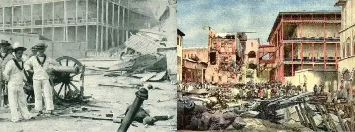 В 9:00 английские корабли начали палить по дворцу. У занзибарцев была всего одна старая пушка и несколько пулемётов, а также яхта султана. Через 15 минут султан сбежал, а от его армии и дворца почти ничего не осталось. Но британцы продолжали стрелять, потому что занзибраский флаг продолжал развеваться над дворцом, его некому было снять. Наконец флагшток обломился, и война закончилась. Она продлилась 32 минуты. 500 защитников дворца погибли, 1 британец получил лёгкое ранение.
