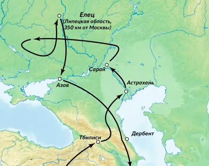 К концу лета 1395 года завоеватели подошли к Рязанскому княжеству, разорили Елец и готовились к рывку на Москву. Русь, будучи данником Орды, рассматривалась её частью, которую также следовало уничтожить. Однако простояв 2 недели в современной Липецкой области, азиатская армия неожиданно повернула в сторону дома.