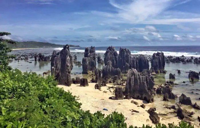 Науру – это коралловый остров вулканического происхождения, расположенный в 42 км к югу от экватора. Его поверхность представляет узкую прибрежную равнину, окружающую слегка приподнятое известняковое плато. На протяжении сотен тысяч лет ветер выдувал с острова породу, создавая в ландшафте углубления и конусообразные возвышенности.