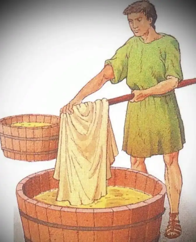 Происходило это следующим образом. Тоги замачивались в больших емкостях с мочой. Потом туда с ногами залазили рабочие прачечной и тщательно топтались по ней. Так, вся скопившаяся грязь быстрее отставала от ткани. После этого тоги полоскали в чистой воде, сушили и чистыми отдавали хозяину.