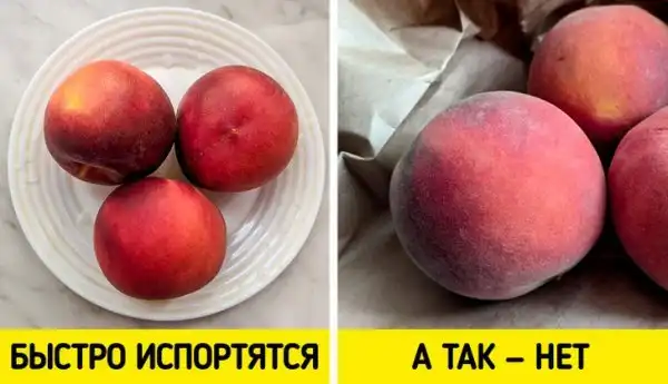 Как и в случае с кабачками, персики не следует мыть до тех пор, пока вы не решите их съесть. Пыль на этих фруктах является естественным консервантом. Неспелые персики можно хранить в бумажном пакете — так они быстрее созреют. Спелые плоды хранятся в холодильнике неделю, если выложить их на полку плодоножкой вниз на небольшом расстоянии друг от друга.