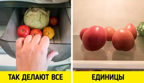 Свежие томаты гораздо дольше будут оставаться сочными, если держать их в холодильнике плодоножкой вниз. Несмотря на то что кожура отлично защищает плоды от высыхания, влага из них выходит через ту область, где прежде был стебель.