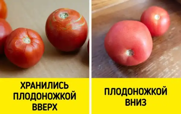 Один повар провел эксперимент. Он взял несколько помидоров, взвесил каждый. А затем часть из них выложил плодоножкой вверх, другую часть — плодоножкой вниз. Через 3 дня он снова поместил на весы каждый томат, и выяснилось, что первая половина плодов потеряла до 7 % веса, вторая — до 2 %.