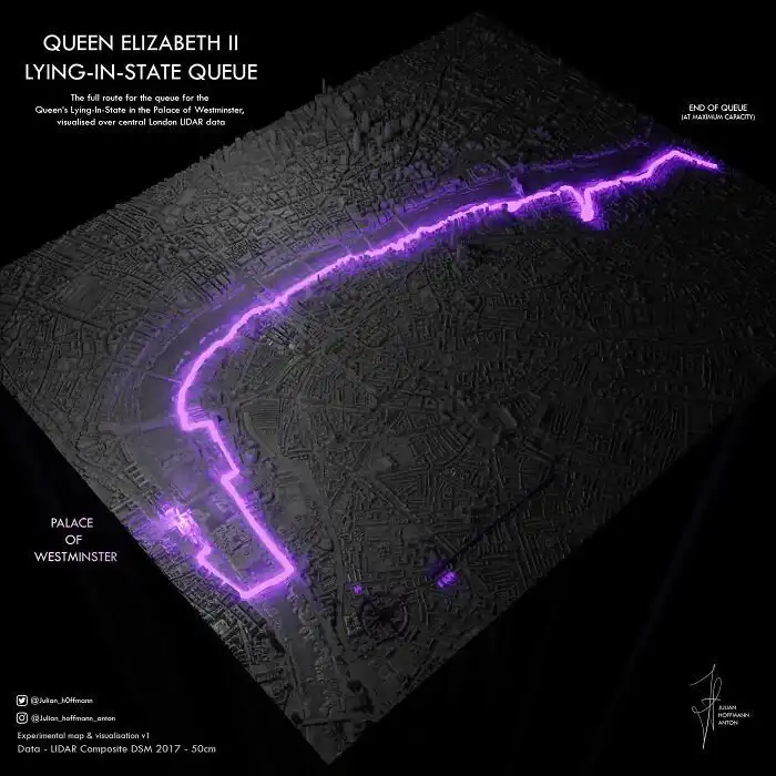 14. Очередь из желающих попрощаться с королевой Елизаветой, выстроившихся вдоль Темзы