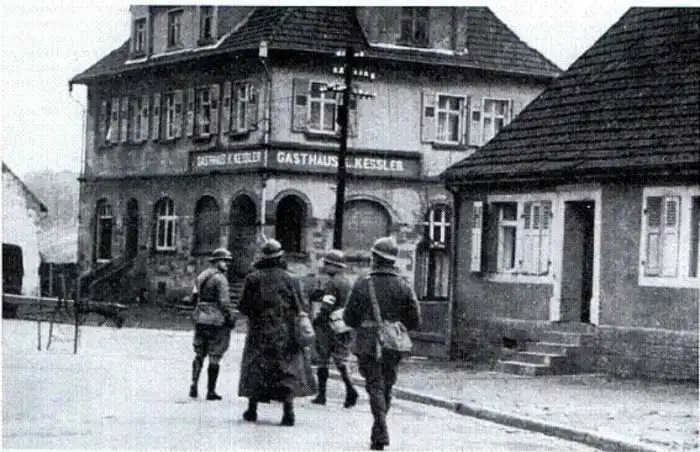 Французский солдат в немецкой деревне Лаутербах в Сааре