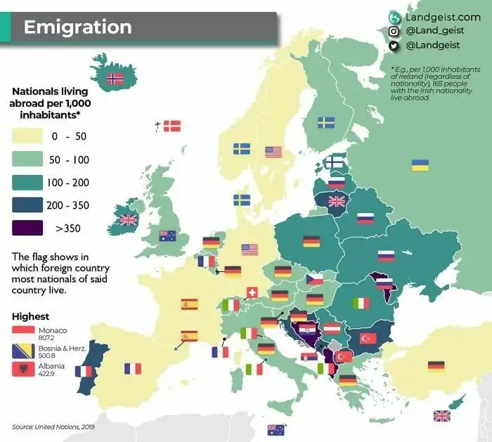 13. Куда мигрируют европейцы и сколько из них живут за границей (количество иностранцев на 1000 жителей; флаг показывает, каких иностранцев в этой стране больше всего)