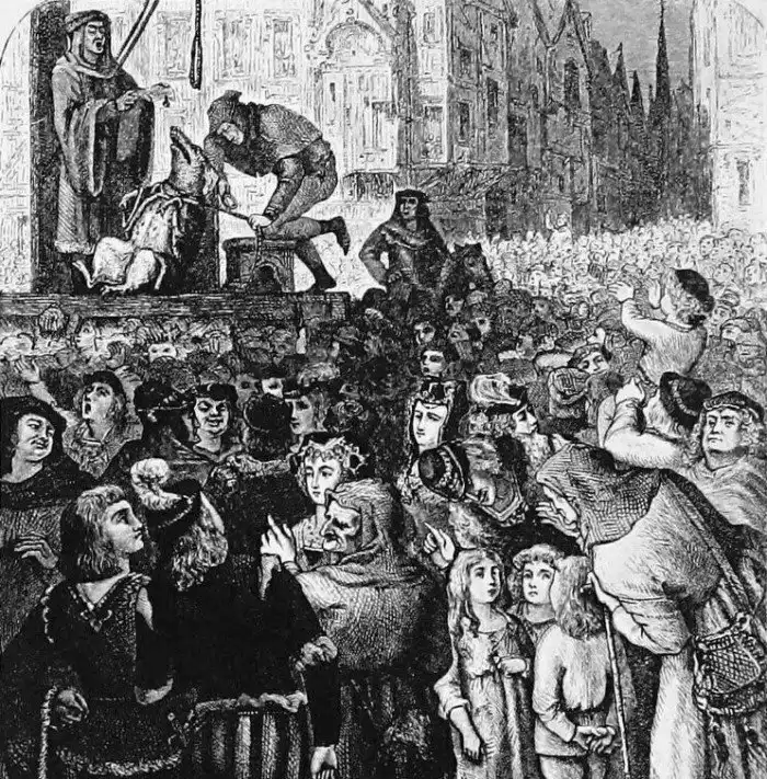 А на этой жутковатой гравюре изображено событие состоявшееся, согласно хроникам, во французском Мелене в 1386 году. Суд приговорил к казни через повешенье свинью, изгрызшую лицо и руки ребёнку. В городском архиве сохранился отчёт по расходам на казнь: "Кормление свиньи в тюрьме: 6 парижских грошей. Палачу для приведения приговора в исполнение: 54 парижских гроша. Плата за телегу, на которой свинья была доставлена к эшафоту: 6 парижских грошей. Плата за верёвку, на которой была повешена свинья: 2 парижских гроша и 8 денариев".