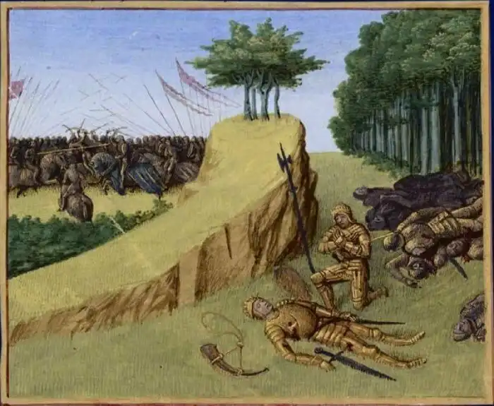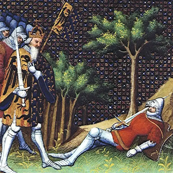 Гибель Роланда. Миниатюра Жана Фуке из рукописи «Больших Французских хроник». Середина XV века
