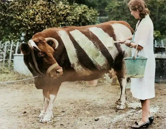 «Пукающий» противогаз и корова-зебра. 5 странных фотографий Второй мировой