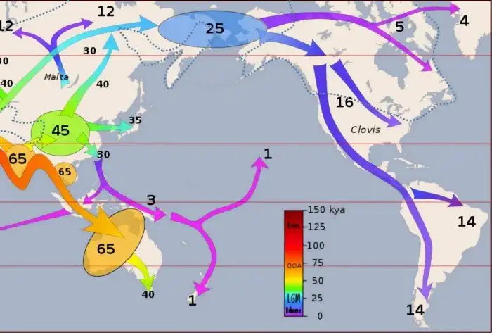 Карта расселения людей в Америку. 1 Kya = 1 тысяча лет назад