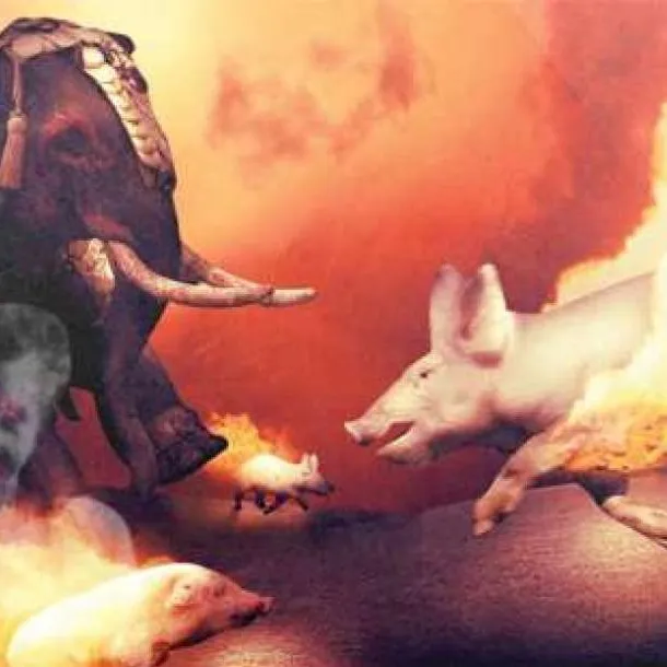 Но жители не стали смиренно сидеть и ждать падения стен. Практически все местные поросята были изловлены, хорошо промаслены и подожжены. Визжащих животных быстро выпустили, и обезумевшие от боли свиньи понеслись прямо на слонов.